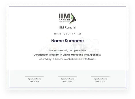 Receive a Certificate of Completion from IIM Ranchi, validating your Digital Marketing expertise and strengthening your professional credibility.