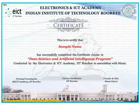Receive a Certificate of Completion from E&ICT Academy IIT Roorkee, recognizing your achievement.